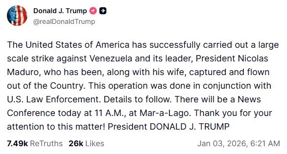 As primeiras explosões foram ouvidas em torno das 2h. A segunda foi por volta das 02h38, enquanto aeronaves continuavam sobrevoando a cidade. “Os Estados Unidos da América realizaram com sucesso um ataque em larga escala contra a Venezuela e seu líder, o presidente Nicolás Maduro, que foi capturado e levado para fora do país juntamente com sua esposa. Esta operação foi realizada em conjunto com as forças policiais dos EUA. Mais detalhes em breve.” Escreveu o Trump em uma rede social.