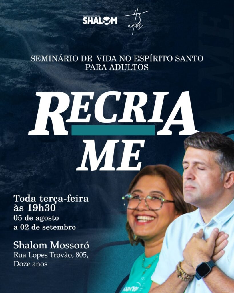 A Comunidade Católica Shalom Mossoró (RN) realiza entre os dias 05 de agosto e 02 de setembro o seminário “Recria-Me”, uma proposta voltada a quem busca um recomeço pessoal e espiritual por meio de uma profunda experiência em coletividade junto ao Espírito Santo.