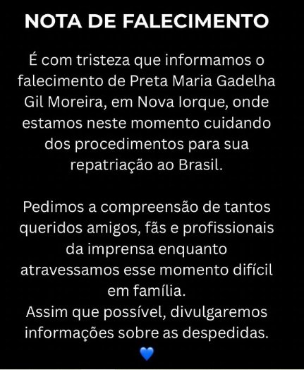 Confira abaixo nota de falecimento emitida pela família.